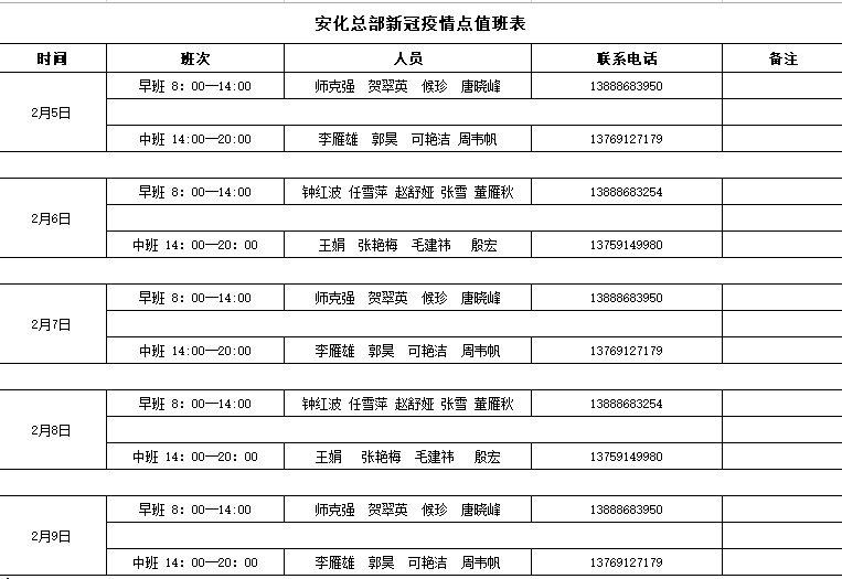 2月5日-2月9日總部職工生活區(qū)疫情防控點(diǎn)值班人員