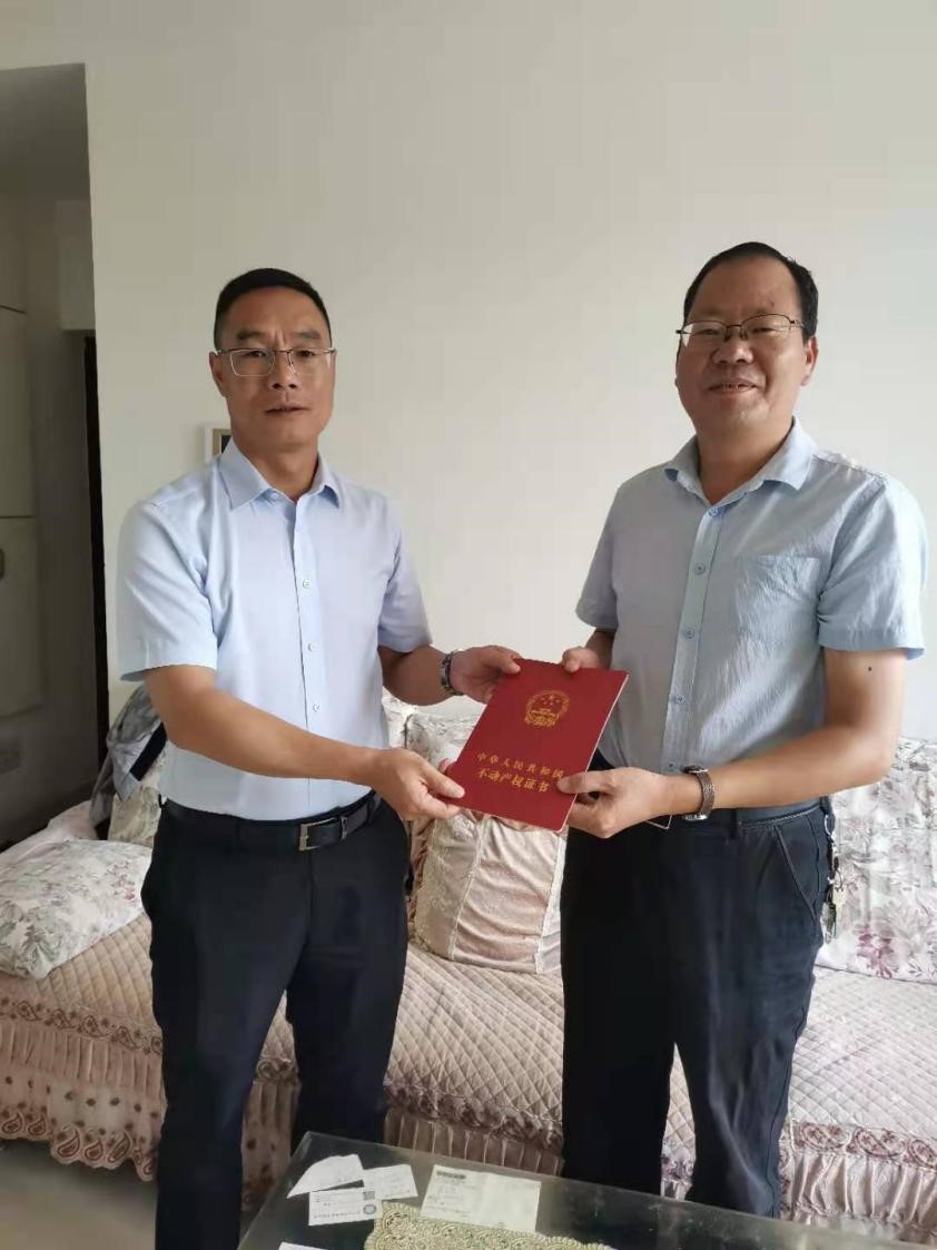 經(jīng)過總部廣大職工住戶及公司長時間的努力及多方面的溝通協(xié)調(diào),7月16日,總部職工家屬生活區(qū)首批16本不動產(chǎn)權證書辦理完畢,正式交到公司。當日,公司黨委書記高劍帶領工作人員親自將不動產(chǎn)權證書送到職工住戶手中。
