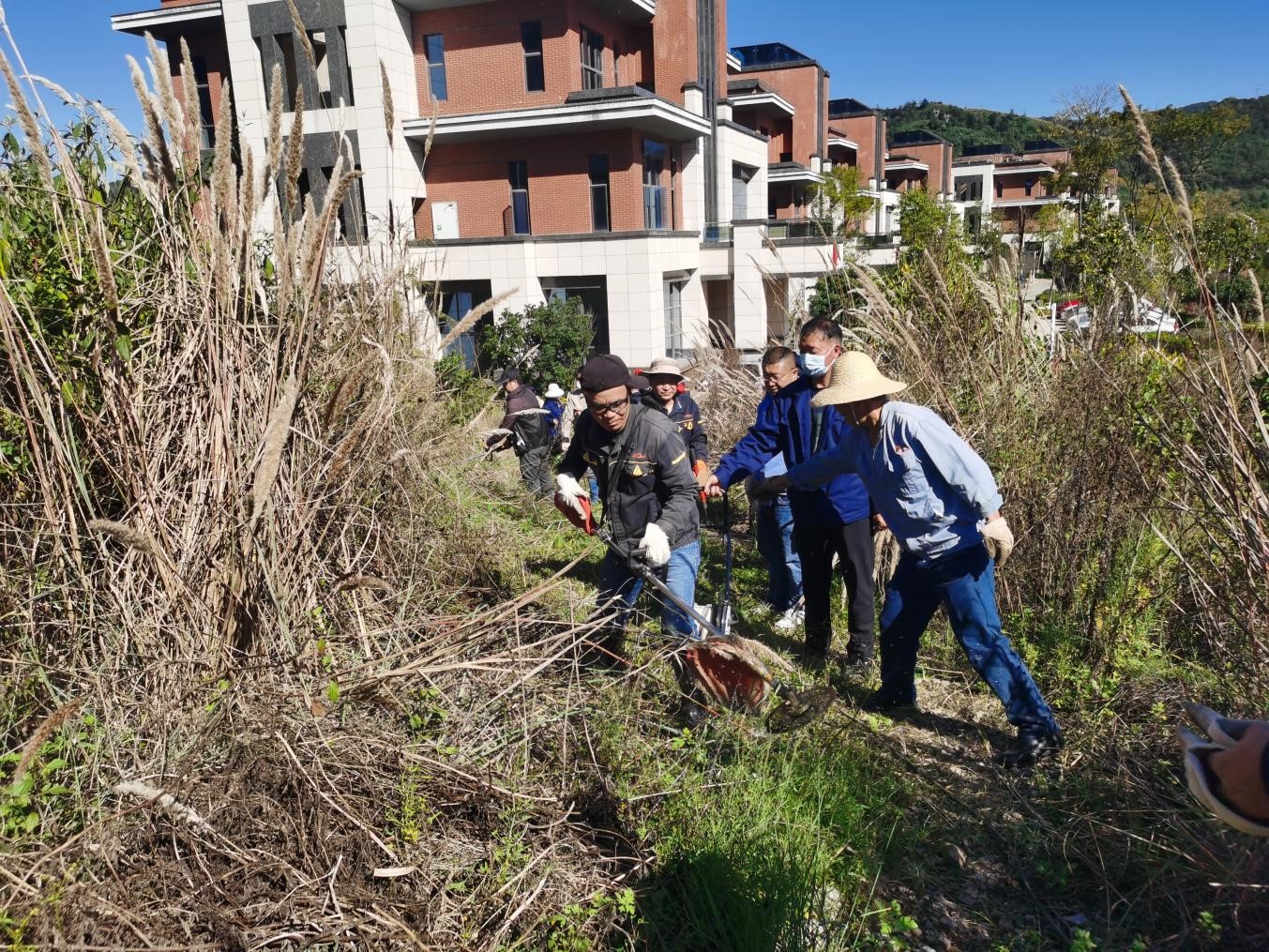 當天大家頂著炎炎烈日,戴著手套,拿著工具對水池周圍一米范圍內的灌木、雜草,樹木進行修枝清理和清除消防泵房周圍一米范圍內雜草。除草區域分片區迅速展開除草行動,有的拿鐮刀割、有的拿鋤頭刨、有的用割草機割、有的拿砍刀砍,還有的直接用手,全然不顧泥草沾滿了褲腿,大家興致高昂、分工合作、積極配合,充分發揮了不怕苦、不怕臟、不怕累的勞動精神,通過三小時的清理原本雜草叢生的水池便煥然一新,回望路邊一個又一個的草垛,大家都露出了開心的笑容。