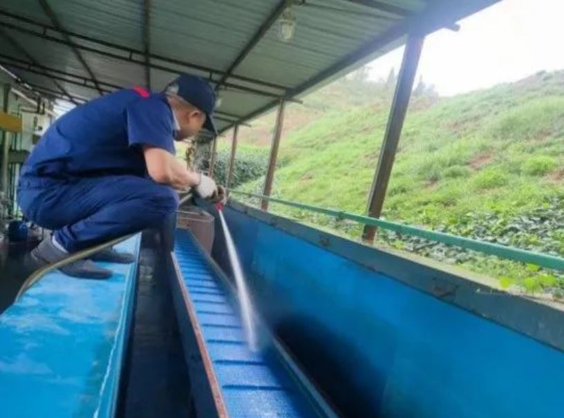 為保證設備正常運行,端午節期間,金沙人化工炸藥生產車間部分黨員、職工們主動放棄假期,利用停產時間,對生產區各類設備進行維護保養、藥卷冷卻鏈板及水池進行徹底清洗。盡管加班期間突遇雷雨天氣,每個人被房檐濺落的雨水打濕了衣服,但他們仍然毫無怨言,仔細清理,不折不扣地完成了清洗保養工作。