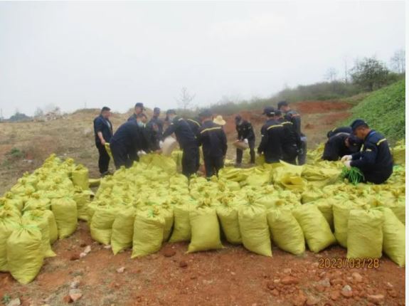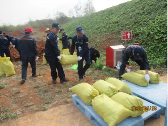 上午9:30全體黨員在總庫(kù)區(qū)集合后,大家分工協(xié)作,首先將2#庫(kù)區(qū)旁裸露的紅土人工裝袋,然后用叉車搬運(yùn)至1#庫(kù)區(qū)防爆土堤下,通過(guò)人力傳遞壘高1#庫(kù)區(qū)防爆土堤,達(dá)到防爆土堤的標(biāo)準(zhǔn)高度。
