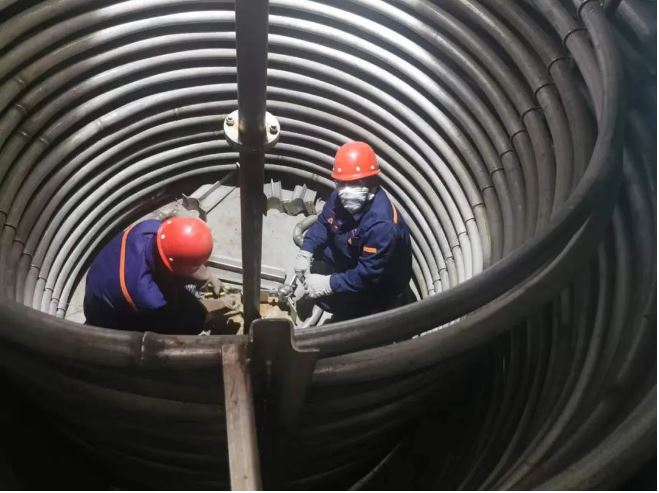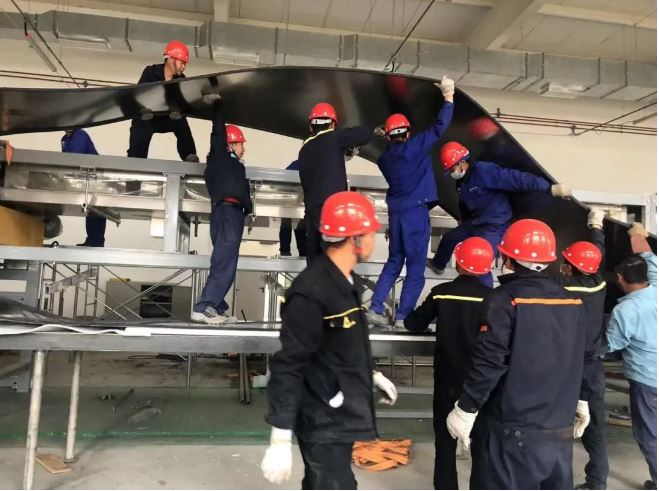 初到異國,安裝隊員們很快克服了當地氣溫驟冷驟熱、時常狂風暴雨的極端天氣和飲食習慣上的不適應,與燃一公司、銳達公司的安裝隊員們一同投入安裝工作中。面對安裝過程中,語言不通、工裝夾具考慮不周全、輔助工具不夠、道路不通等問題,大家集思廣益,群策群力:語言不通,用手比劃;叉車不夠就肩扛手提;道路不通就填土鋪板;叉車動力不足就借用土建方的裝載機、挖機、隨車吊、汽車吊。隊員們趴在地上畫線、頂著風切割材料、操作著大型砂輪機切割型材、在烈日下焊接安裝已成了工地上的一道“風景線”。整個工地無論室內室外,口號聲此起彼伏,相互回應,進設備、進材料,畫線、定位、制作平臺,安裝管路,安裝線路,壓力試漏修補,制作保溫安裝,涂漆,打掃衛生等一系列安裝工作都進行得井然有序。