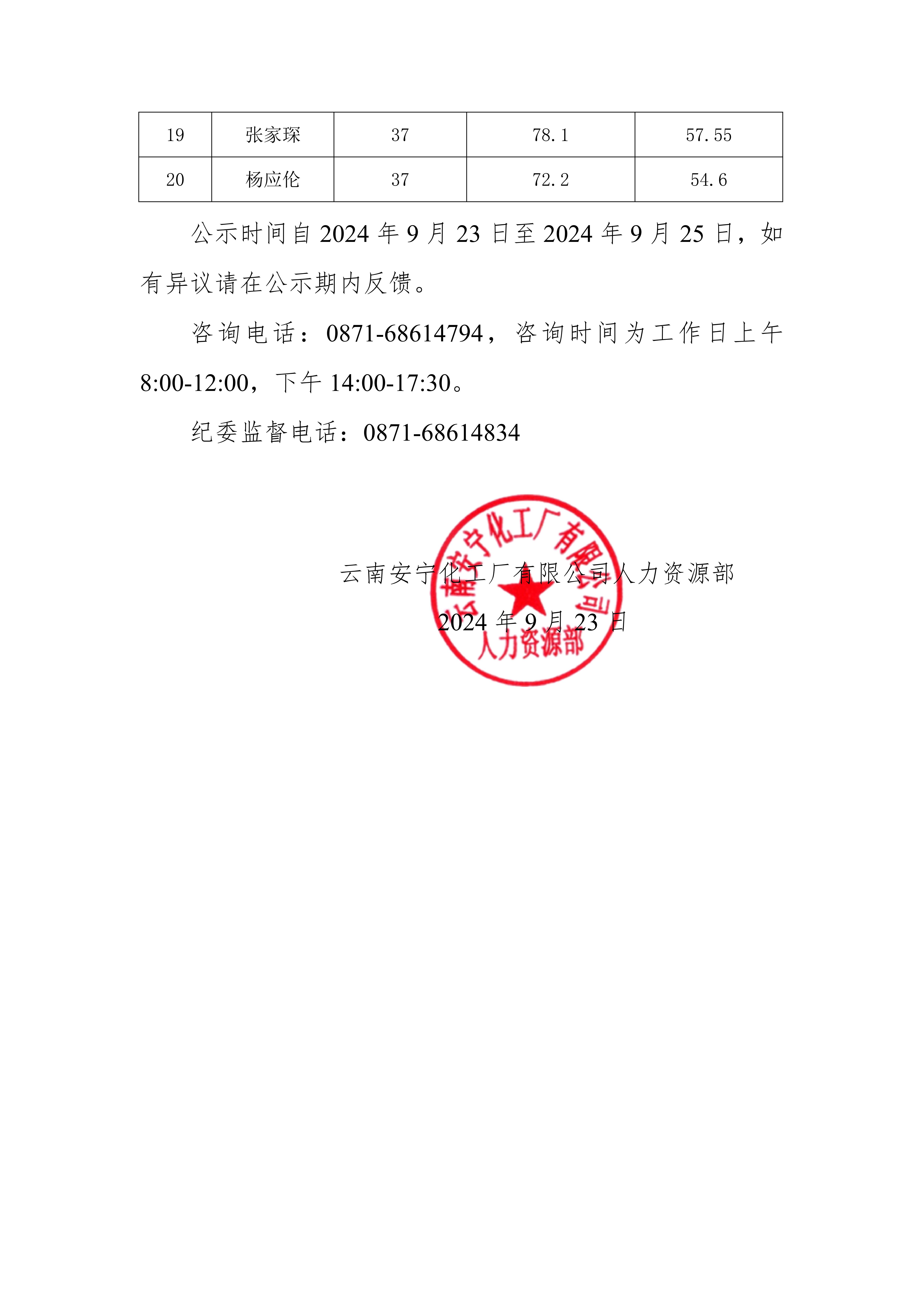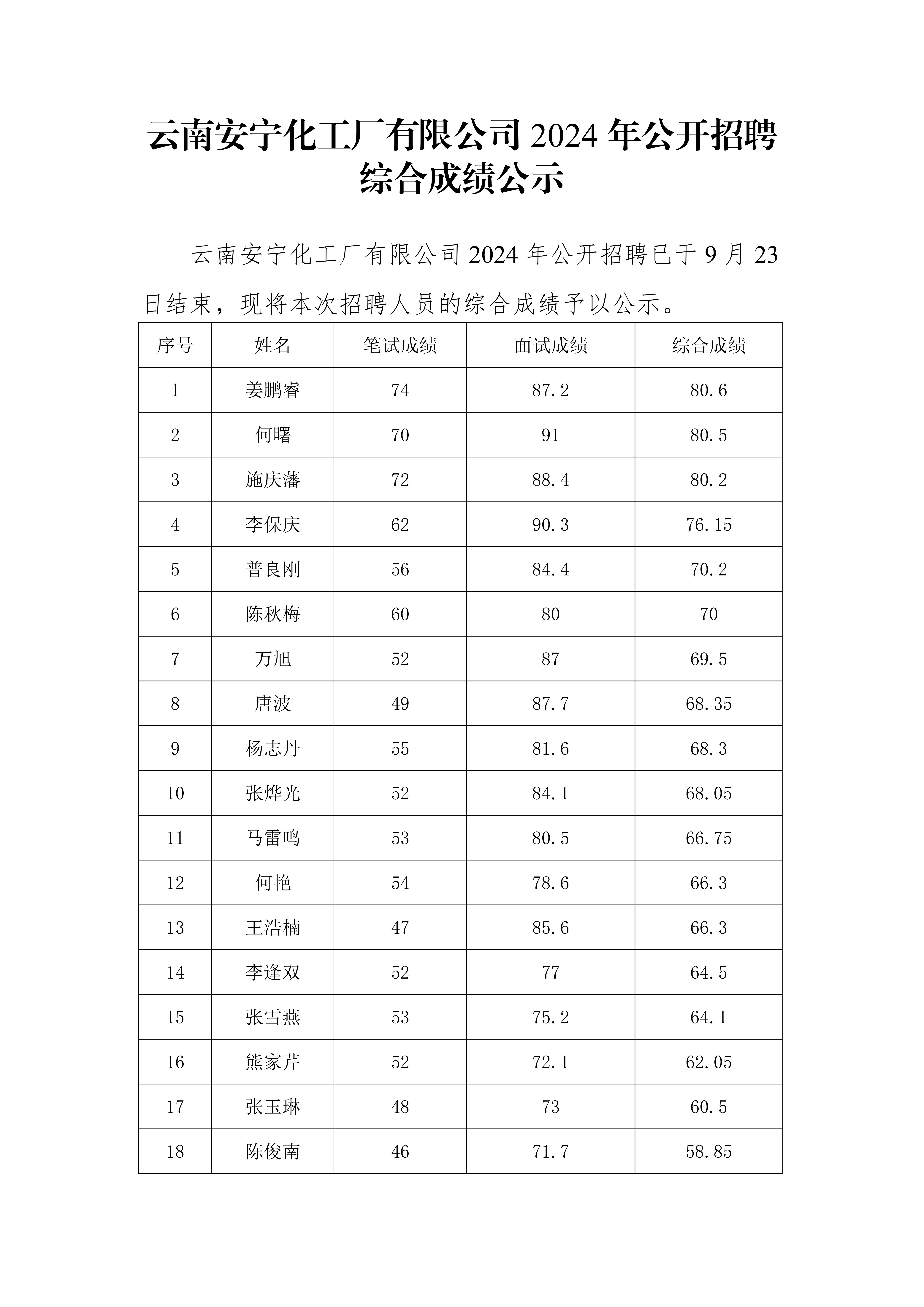 云南安寧化工廠有限公司2024 年公開招聘綜合成績公示