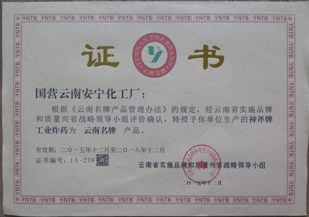 2015年12月,經云南省實施品牌和質量興省戰略領導小組評價確認,我廠的“神斧牌”工業炸藥被繼續授予為云南名牌產品。2016年9月6日,我廠應邀出席安寧市人民政府召開的2016年質量強市工作推進會,會上,市政府領導對2015年獲得云南名牌產品企業進行了表彰,同時頒發了證書和牌匾。